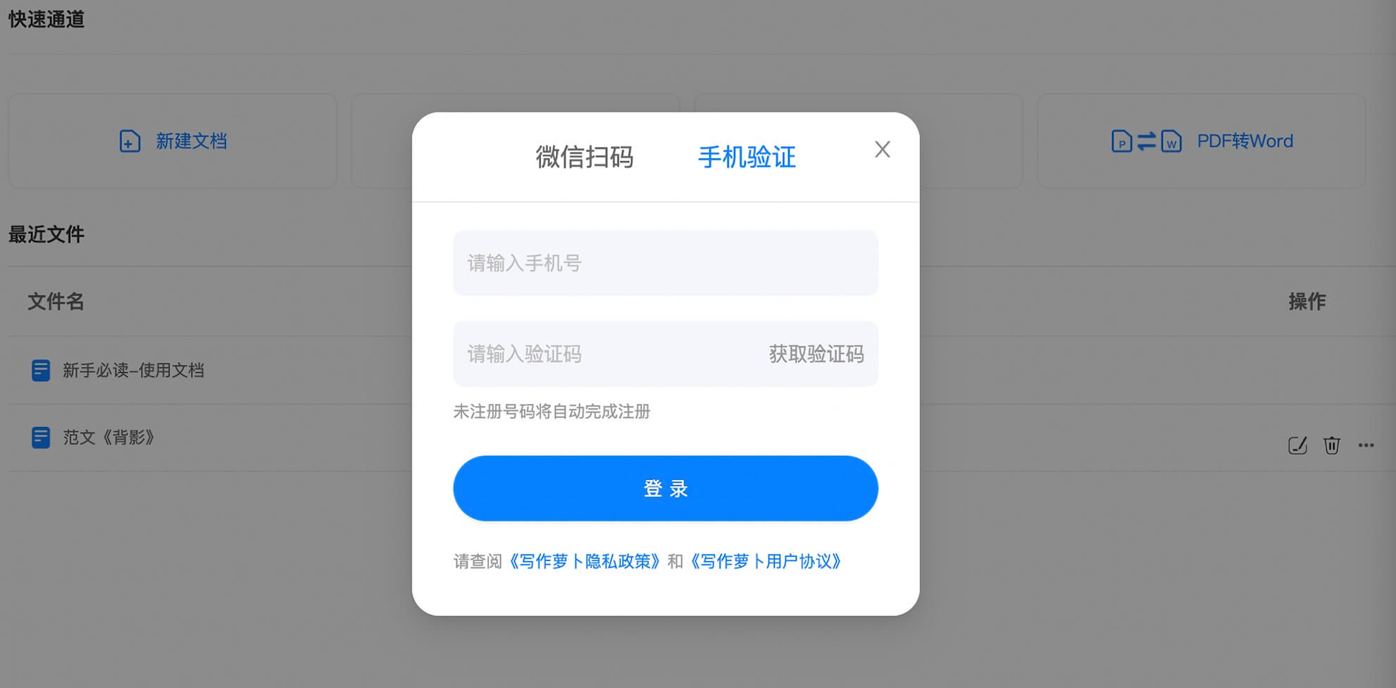 在浏览器输入官网地址:https://xiezuorobot.com 打开写作萝卜首页,点击网页右上角“登录”按钮,输入手机号验证码完成登录,如果你已绑定微信,那么扫码登录会更方便快捷。