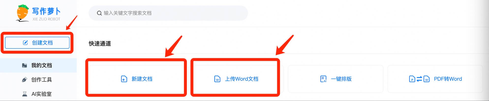 打开写作萝卜首页,找到左侧菜单栏顶部的“创建文档”或“新建文档”,也可以通过“上传Word文档”来导入已有文章文件,进入智能改写页面。
