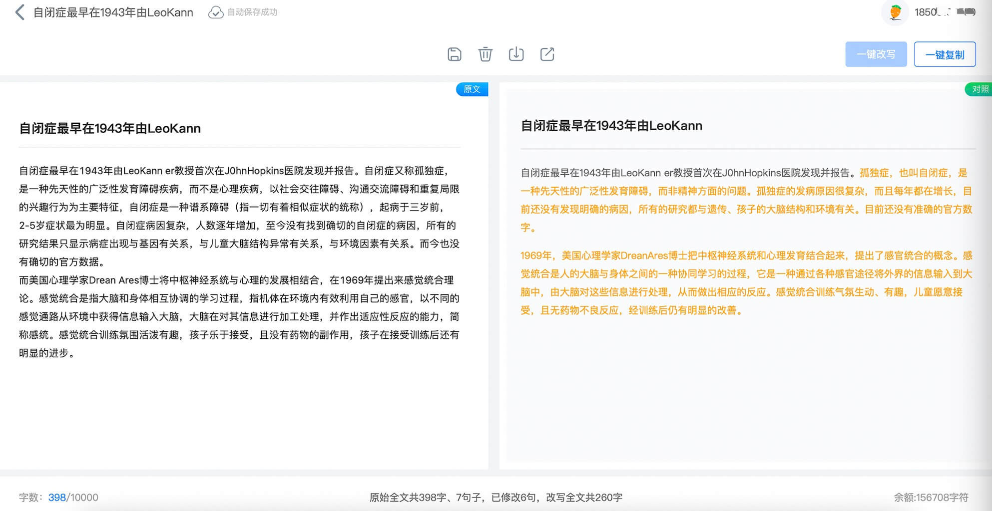 改写过程大概需要等待几秒钟,然后一篇新鲜的低重复率文章就会出现在页面右侧,你可以一键复制改写后的文章内容,也可以点“下载”图标把Word版本的下载到本地。改写如此简单,赶快去试试吧~